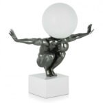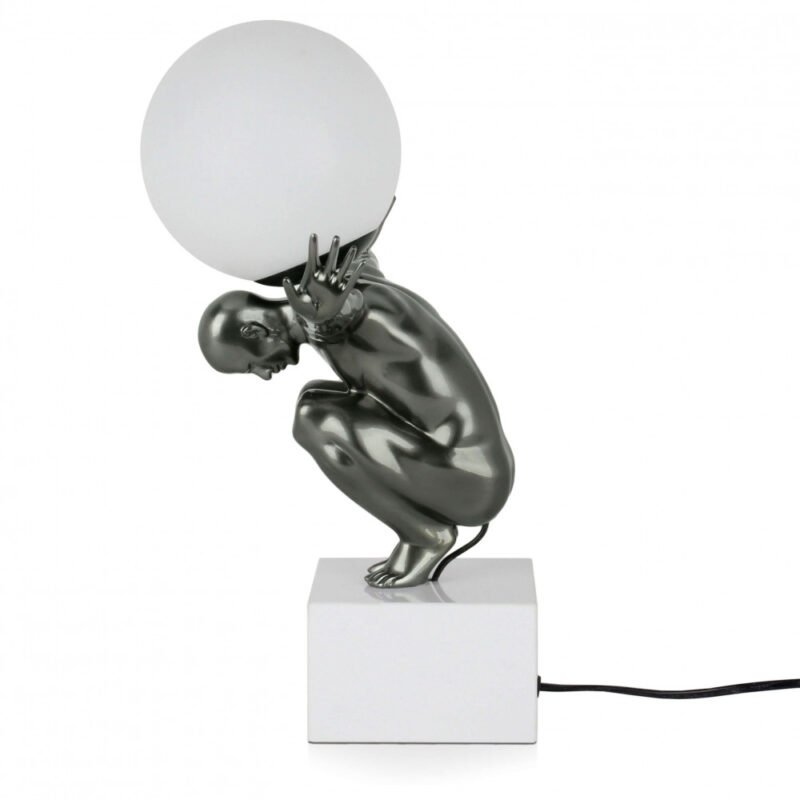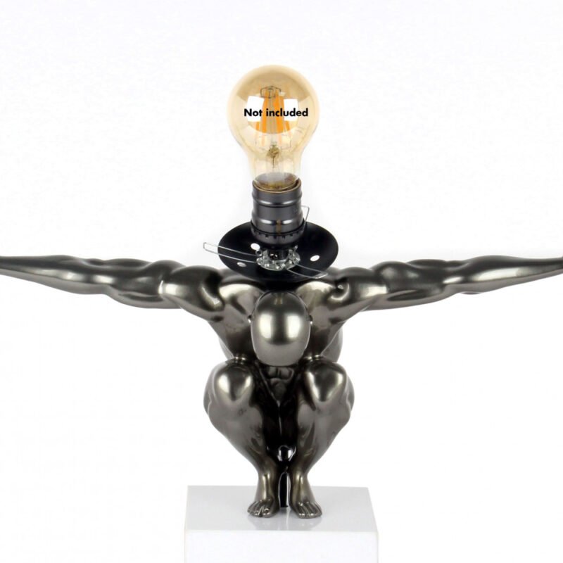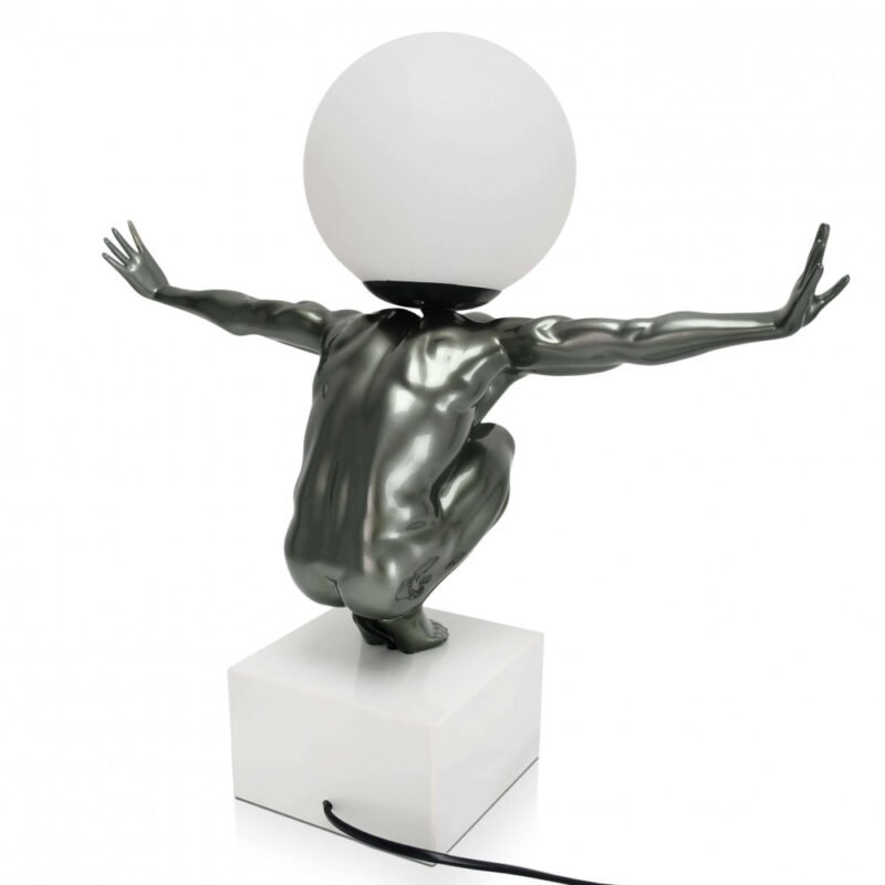 Moderne figurative Skulptur-Tischleuchte aus Kunstharz in Metalloptik mit Marmorsockel.