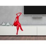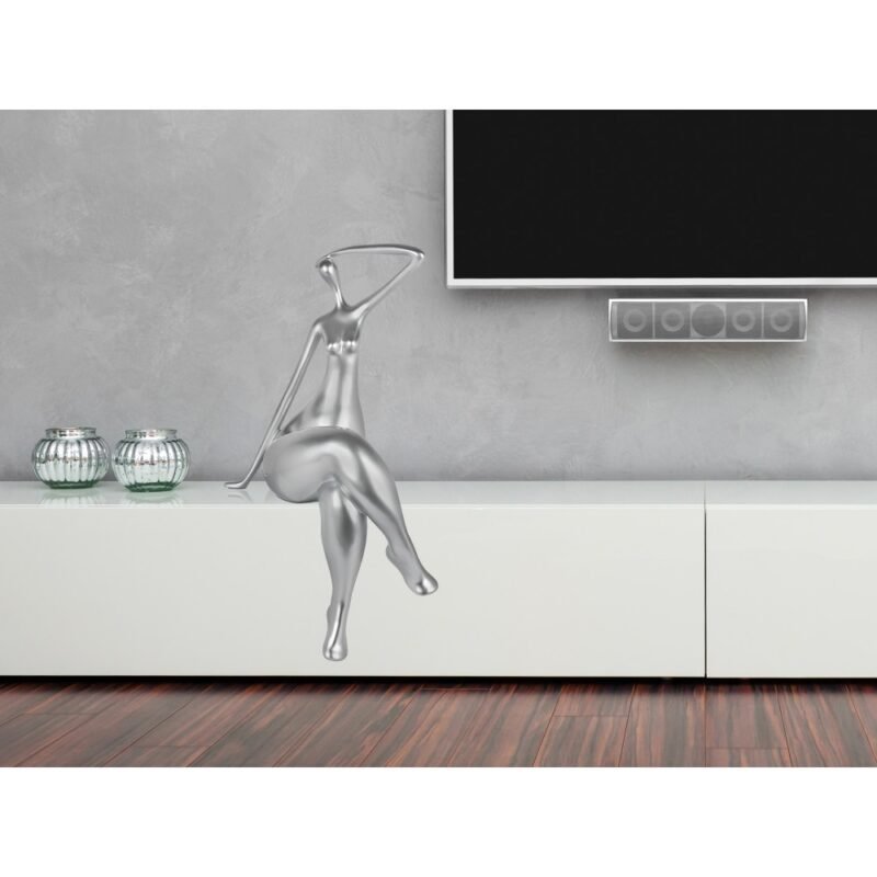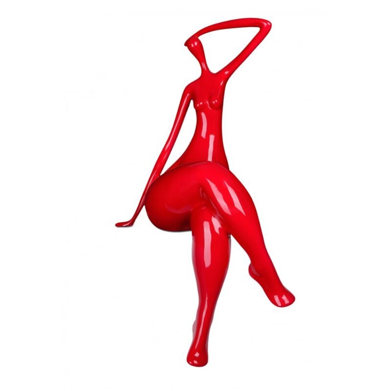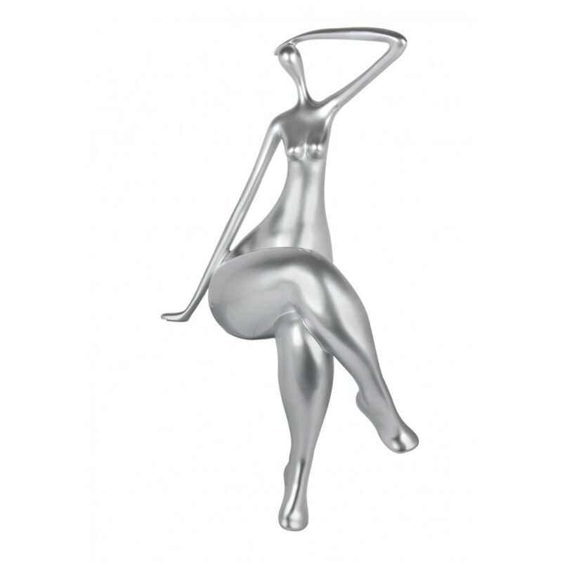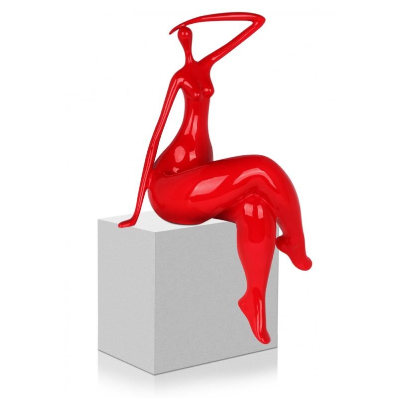 Die Skulptur zeigt eine weibliche Figur in wartender Pose und ist aus lackiertem Kunstharz handgefertigt. Die Frau sitzt mit übereinandergeschlagenen Beinen, ein Arm stützt sich auf dem Boden ab, während der andere Arm mit angewinkeltem Ellbogen über dem Kopf liegt und die Hand am Hinterkopf ruht.