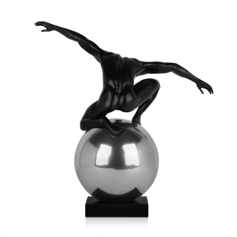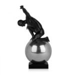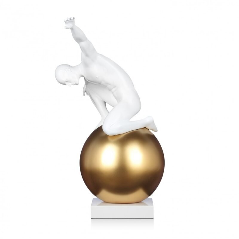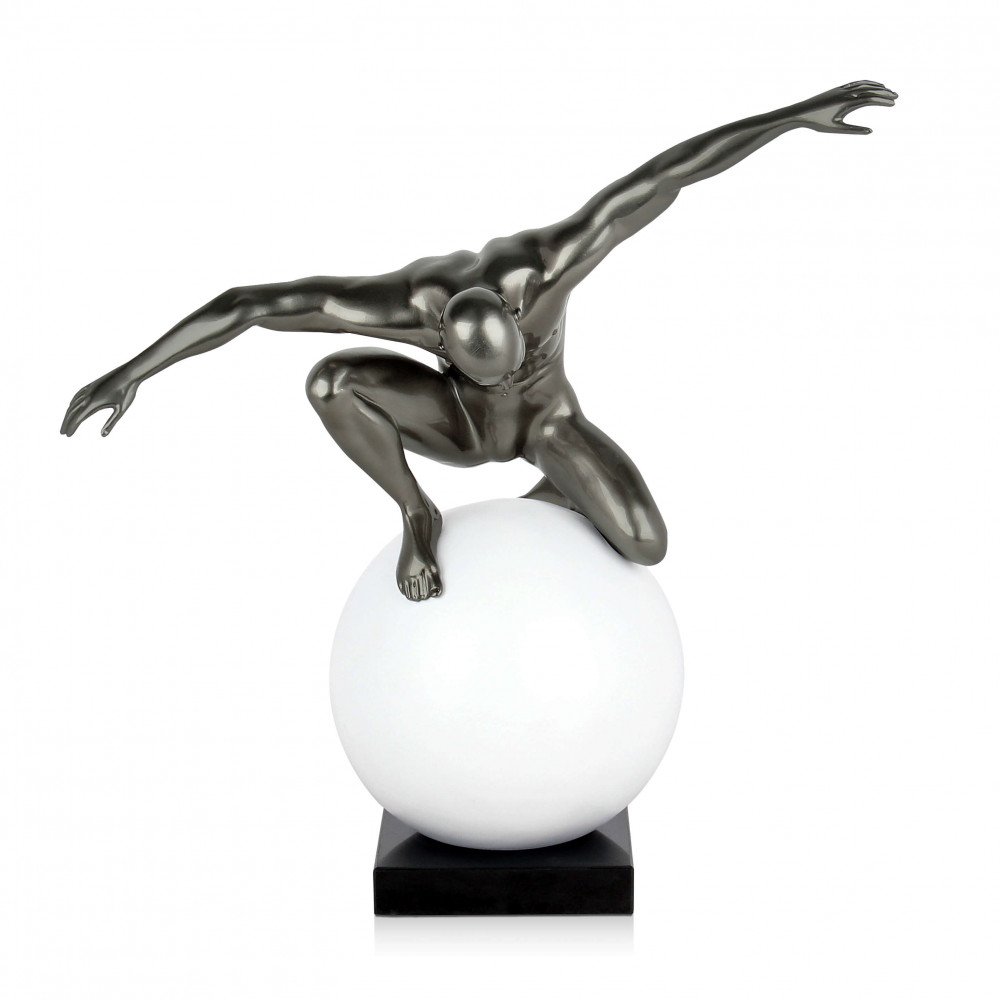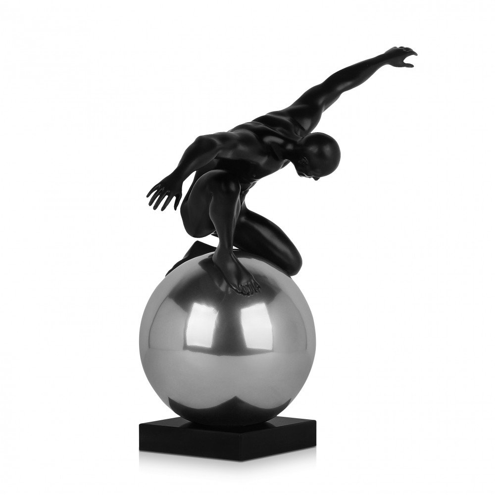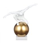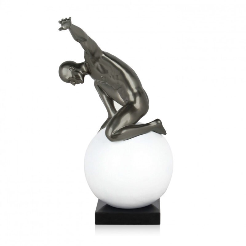 Moderne figurative Skulptur aus seidenmattem Kunstharz mit Kugel in Metalloptik und Marmorsockel