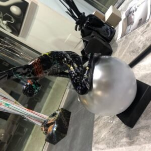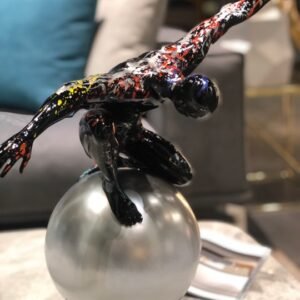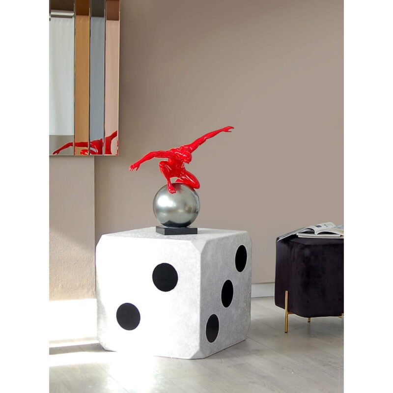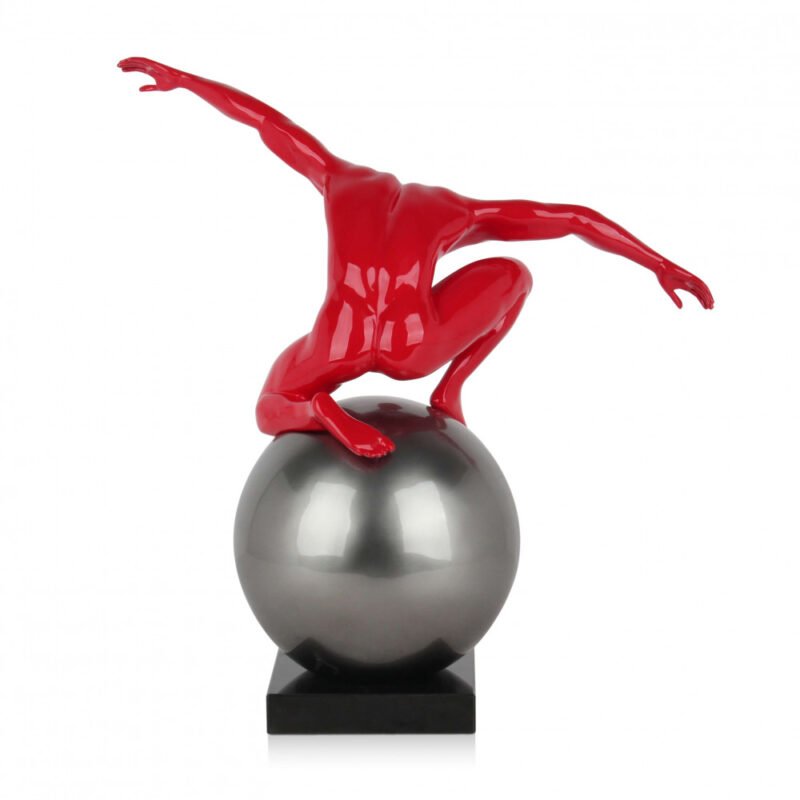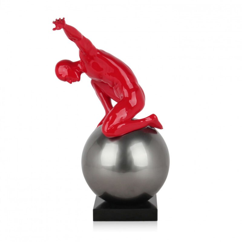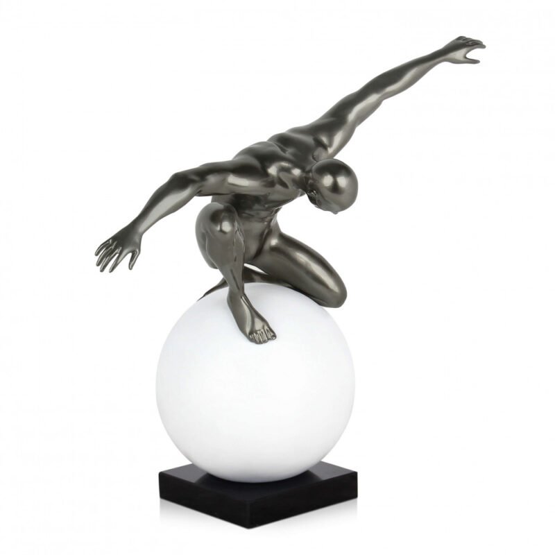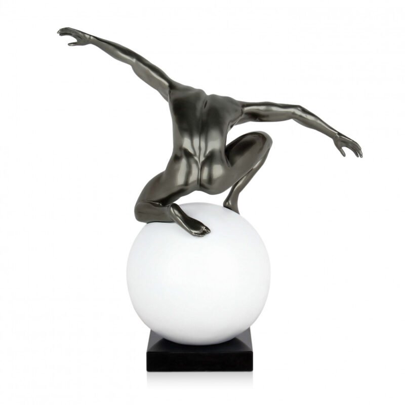Moderne figurative Skulptur aus seidenmattem Kunstharz mit Kugel in Metalloptik und Marmorsockel