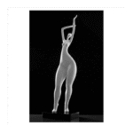 Eine weibliche Figur, die auf einem schwarzen Marmorsockel ruht und die Arme zum Himmel erhoben hat.